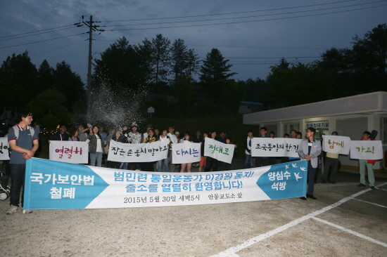 이른 시간임에도 안동교도소 앞에는 범민련 남측본부, 통일광장, 한국진보연대, 민가협양심수후원회 회원들과 대구·경북, 서울, 안산을 비롯한 전국 각지에서 모인 150여명이 꽃다발을 들고 동지가를 부르며 이경원 전 사무처장의 출소를 환영했다.