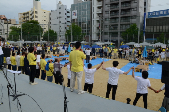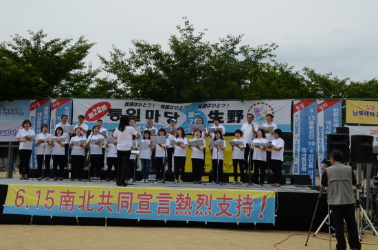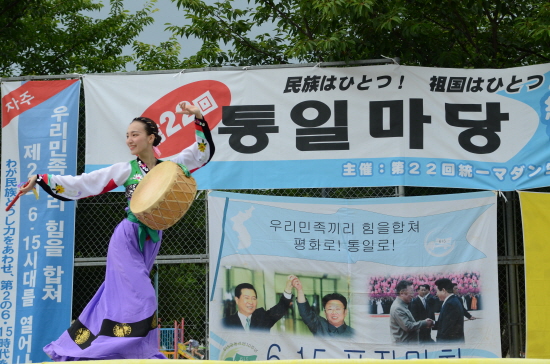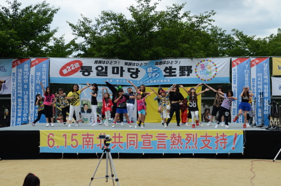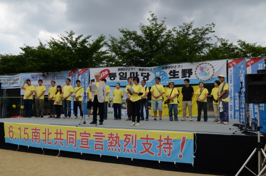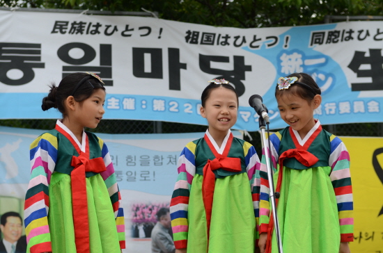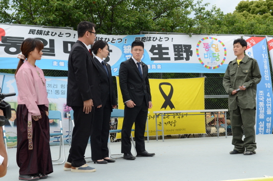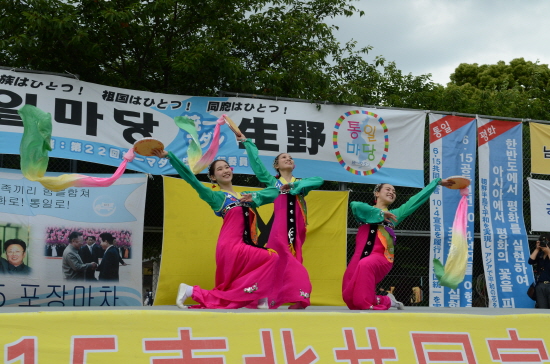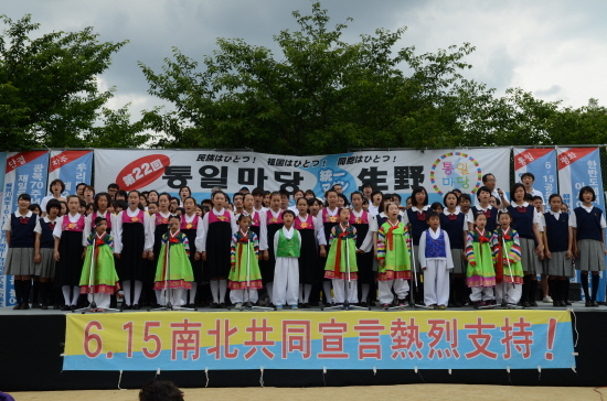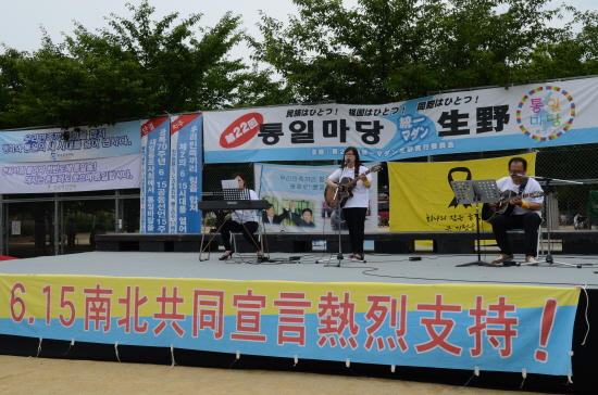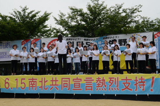 ▲ 지난 7일 정오 일본 오사카에서 열린 제22회 통일마당이쿠노 행사에 초청받은 615합창단이 피날레 무대에 올라 통일의 염원을 노래하고 있다. [사진 - 통일뉴스 류경완 통신원]