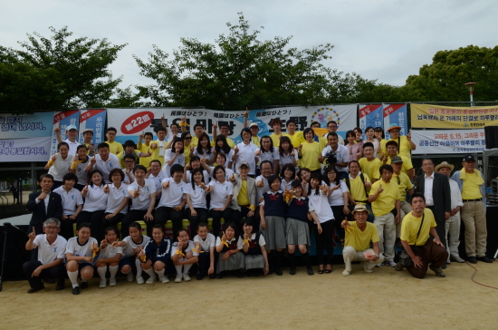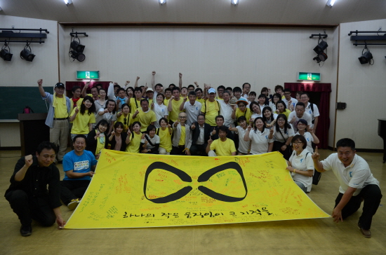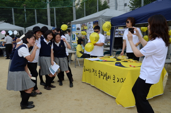 ▲ 공연 중간에 별도로 세월호 부스를 차리고 동포들에게 노란 리본과 풍선, 홍보지를 나눠주며 대형 현수막에 서명을 받고 있는 합창단원들. 조선학교 학생들과 기념촬영을 하고 있다. [사진 - 통일뉴스 류경완 통신원