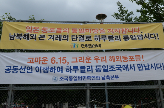 ▲ 행사장 주변을 채운 남측 단체들의 축하 현수막. 전국농민회총연맹, 전국여성연대, 조국통일범민족연합남측본부, 한국진보연대, 한국청년연대 등은 연대사를 통해 “6.15공동선언 발표 15돌, 광복 70돌을 맞은 올해 남북해외 각계각층이 제2의 6.15시대를 열어가려는 결의에 차 있다”고 상기하고, “22회째를 맞이한 통일마당이쿠노 행사를 통해 일본 및 동포사회 안에서도 연대와 협력, 평화와 통일의 기운이 드높아질 것으로 확신한다”고 축하 인사를 전했다. [사진 - 통일뉴스 류경완 통신원]