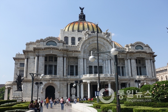 우리가 한참 동안 헤매다 찾은 곳은 중앙 우체국 건너편에 있는 예술 궁전. 1904년에 이탈리아 건축가 아다모 보아리(Adamo Boari)가 건설하기 시작했으나 혁명으로 중단되었다가 1934년 멕시코 건축가 페데리코 마리스칼(Federico Mariscal)에 의해 완성된 멕시코 예술과 문화의 중심지. 건축에 문외한인 내가 보아도 웅장하고 멋지다.