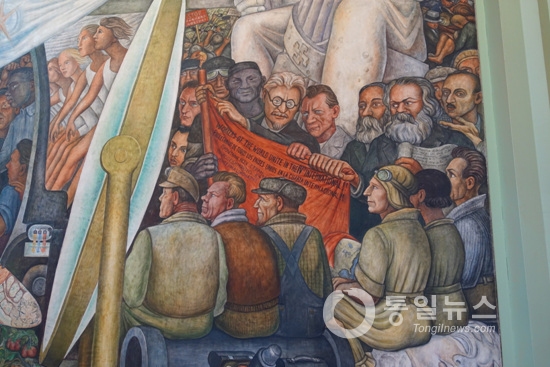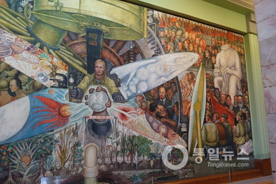 디에고 리베라와 데이비드 알파로 시퀘이로스, 루삐노 타마요, 호르게 곤잘레스 카마레나 등의 벽화가 복도에 전시되어 있었다. 이 가운데 가장 유명한 그림은 디에고 리베라의 <인간, 우주의 지배자>(El Hombre, Contraldor del Universo)라는 작품. 이 그림은 원래 뉴욕의 록펠러센터에 걸릴 예정이었으나 그림 속에 레닌과 트로츠키, 마르크스 등 공산주의자들이 들어 있다는 이유로 이의 수정을 요구하자 리베라가 이를 거부해 멕시코에서 가져와 예술 궁전에 걸게 되었다. 그림은 색감, 구도, 전체적인 내용 등 여러 면에서 완성도가 있었다. 디에고 리베라의 대표작 중 하나로 평가되고 있다.