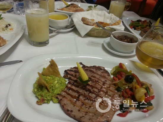 예술 궁전 관람 뒤에도 우리는 멕시코시티 구시가지 이곳저곳을 한참이나 걸어 다니며 구경했다. 모두들 지칠 무렵 숙소에서 그다지 멀지 않은 곳에서 적당한 식당을 발견했다. 멕시코식의 양식을 파는 레스토랑이었는데, 음식은 풍성하고 맛도 좋았다. 가격도 그다지 비싸지 않았다. 생선(참치) 스테이크, 소고기 스테이크 등을 시켰다. 소고기는 육질이 아주 부드러웠다. 반면, 참치는 의외로 한국산 소고기처럼 육질이 질겼다. 참치도 부위에 따라 육질이 다양하다더니 정말 그런 모양이다. 맥주도 한잔씩 마셨다.