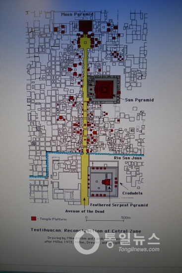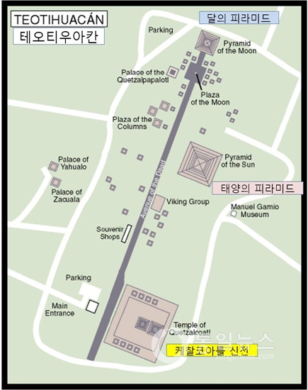 테오티우아칸은 남북(실제로는 북북동향)으로 길게 난 ‘죽은자의 거리’를 축으로 발달된 고대 도시다. 이 죽은자의 거리는 길이가 약 2.5킬로미터에 이르고 폭이 약 40~90미터네 이르는 큰 도로다. 이 도로를 중심으로 대칭적으로 도시가 발달되었던 것.