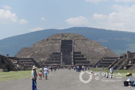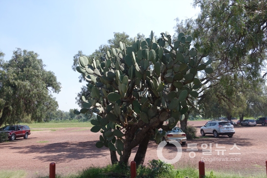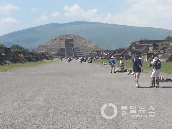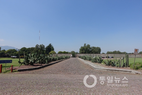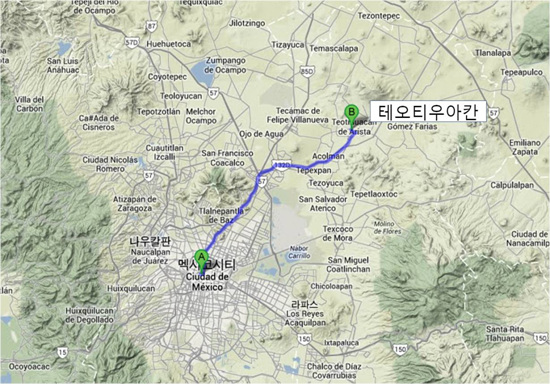 버스는 멕시코시티 외곽도로를 따라서 한동안 달렸다. 시원한 바람과 함께 대도시 주변의 거대한 주거지와 산업단지들이 나타났다. 산업공단도 보고, 빈민가 산동네도 보았다. 도시 외곽으로 빠지면서 풍경이 조금씩 달라졌다. 곳곳에 블록으로 짓다만 집들이 방치된 채 있었다. 외곽 변두리를 지나자 시골마을과 자연풍경이 나타났다. 꾸불꾸불 시골길을 달리다가 다시 자동차 전용도로를 탔다. 그리고 다시 시골길로 접어들었다. 지형이 달라졌다. 저 멀리 넓은 평야와 구릉지대가 펼쳐졌다. 아마도 유적지가 가까워진 모양이다. 그런 길을 한 20분쯤 달렸을까? 테오티우아칸 입구 주차장에 도착했다. 멕시코 시에서 40킬로미터 정도 북북동쪽에 떨어져 있는 이곳까지 오는데 걸린 시간은 대략 1시간 30분 정도. 승용차를 탔다면 훨씬 시간이 적게 걸렸을 것이다.