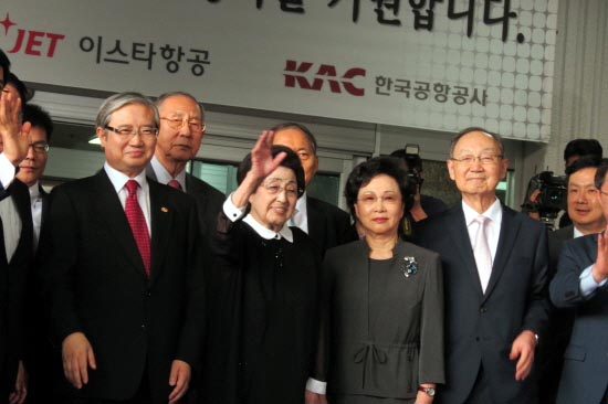 이희호 여사는 이날 오전 9시 20분께 서울 김포공항에 도착해 기다리고 있던 수십 명의 환영객들과 일일이 손을 잡고 인사를 나누고 미리 나와 있던 수행원들과 함께 기념 촬영을 한 후 곧바로 출국장으로 향했다.