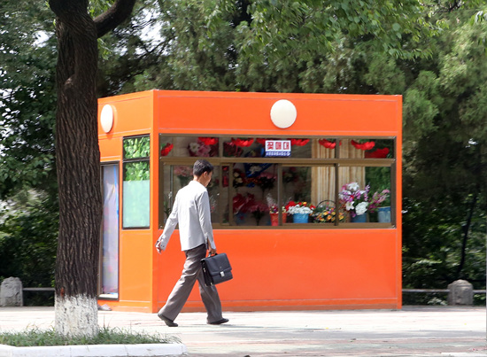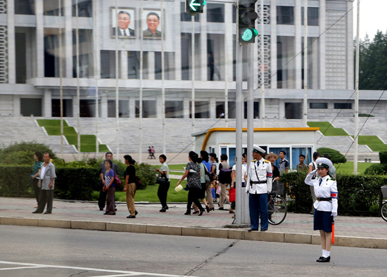 ▲ 평영거리의 교통경찰들. 뒷 건물에 김일성-김정일 초상화가 보인다. [사진제공-김대중평화센터]