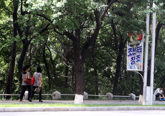 ▲ 평양의 공원을 걷고 있는 여성. '김정은시대'의 구호인 '조선속도 창조' 선전물이 보인다. [사진제공-김대중평화센터]