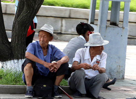 ▲ 노인들이 길가에 앉아 쉬고 있고, 그 뒤에선 젊은 여성이 휴대폰으로 통화를 하고 있다. [사진제공-김대중평화센터]