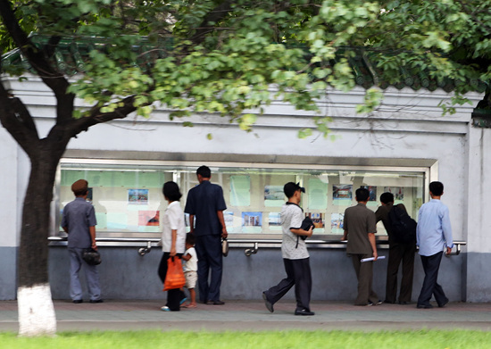 ▲ 길가 전시대를 구경하고 있는 평양시민들. [사진제공-김대중평화센터]