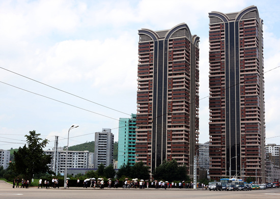 ▲ 평양거리의 고층빌딩. 양산을 든 평양시민들과 신호를 기다리는 차량들이 보인다. [사진제공-김대중평화센터]