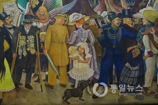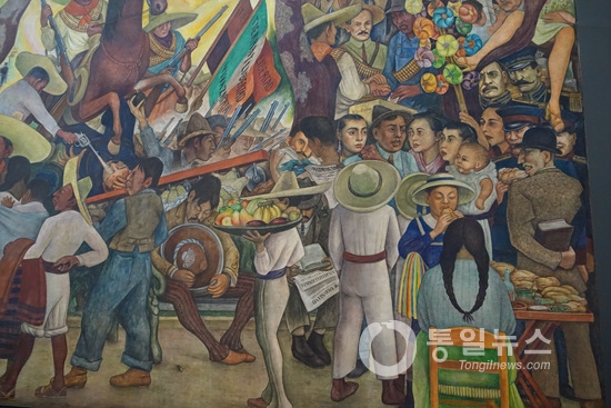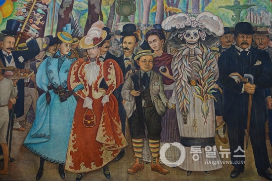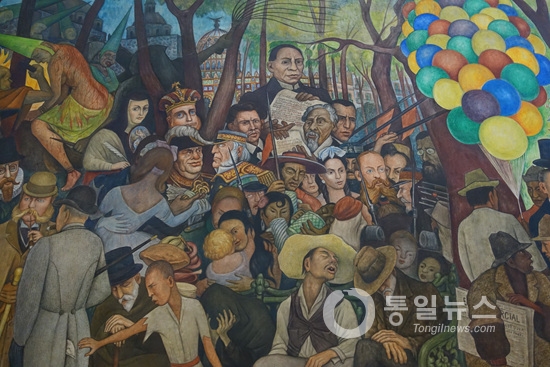 힘들 게 찾아간 그곳에는 실망스럽게도 리베라의 그림은 단 한 점밖에 없었다. 한쪽 벽면을 완전히 채운 긴 벽화다. 그림은 압도적이지는 않지만 멕시코 근현대사를 상징하는 인물들이 대거 망라되어 있어서 볼거리가 많았다. 이 그림 한 점만으로도 한 권의 책이 가능하겠다는 생각이 들 정도로 많은 내용을 담고 있다. 한쪽 벽 전체를 꽉 채운 대작이다. 벽화에 자신과 프리다 칼로까지 등장하는 것이 재미있고 이채롭다. 리베라의 넘치는 기운과 충만한 에너지가 느껴지기보다는 성찰과 풍자의 느낌이 드는 그림이었다.