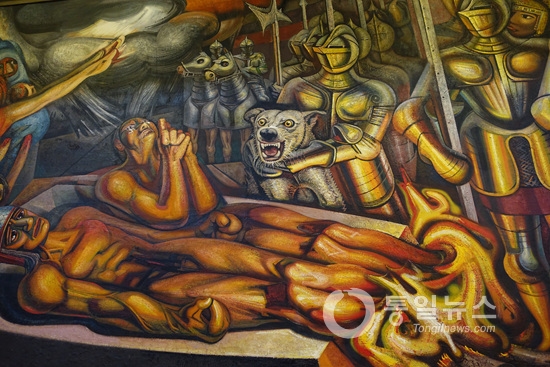 혁명기념관을 나온 뒤 우리는 ‘디에고 무랄(벽화) 박물관’을 찾기 위해 걸음을 재촉했다. 박물관은 그곳에서 불과 15분 내의 거리에 있었으나 정확한 위치를 찾지 못해 1시간 이상을 헤맸다. 그 바람에 더운 날씨에 모두들 몸이 지쳤다. 고생 끝에 찾아낸 박물관은 전날 우리가 지나갔던 알라메다 공원 한 귀퉁이에 있었다. 저절로 ‘이런∼’소리가 나온다. 아무리 약도를 봐도 찾기가 쉽지 않았는데, 찾고 보니 바로 여긴 걸 그렇게 헤매다니….