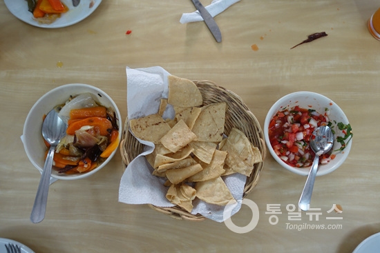 우리는 메뉴판을 보고 요리를 3개만 시켰다. 음료수도 시켰다. 먼저 낫쵸와 소스, 멕시코식 야채절임이 나왔다. 야채절임은 고추, 오이, 양파 같은 야채를 간장에 절인 것으로 느끼하지도 않고 먹을 만했다. 아마도 우리의 김치에 해당하는 것이 아닐까 싶었다. 우리는 본요리가 나오기도 전 이걸로 웬만큼 배를 채웠다. 뒤이어 요리가 나왔고, 우리는 그걸 하나도 남김없이 해치웠다.