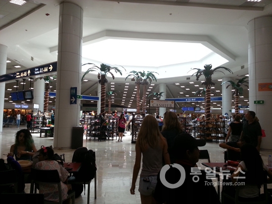 코리아에 대한 호의적인 반응을 느낄 수 있어서 기분이 좋았다. 비행기 탑승 게이트는 A6이다. 그 근처에서 간단히 요기를 했다. 피자와 파스타를 먹었다. 맛이 괜찮다. 난 평소에 파스타는 거의 입에 대지도 않는 편이지만 이곳에서는 즐겨 먹는 맛있는 음식이 되었다. 칸쿤 국제선 대기실은 멕시코이지만 멕시코가 아닌 듯한 느낌이 들었다. 멕시코인인 듯한 사람은 거의 보이지 않는다. 대부분 외국인들이다. 백인이 대부분인데 유럽과 미국에서 온 사람들로 보였다. 일부 라틴계 백인과 메스티소, 그리고 소수의 흑인과 동양인이 있었다.