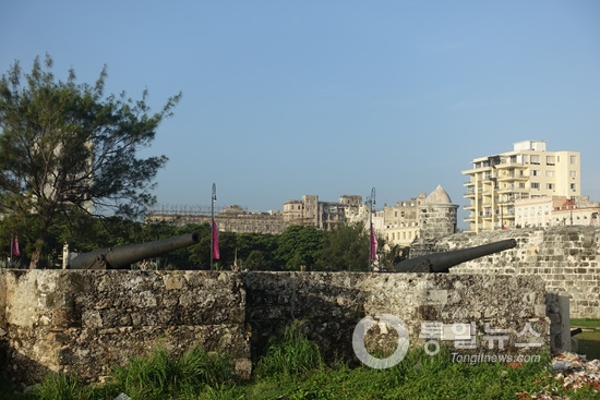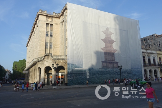 우리가 까삐똘리오 앞에서 사진을 찍고 있는데 그 맞은편에 우리에게 익숙한 그림이 눈에 들어왔다. 분명히 한국의 석탑을 찍어 놓은 대형 걸게 사진이었다. 나는 그것이 무엇인지, 왜 그곳에 그런 대형 걸게 사진이 걸려 있는지 도무지 알 수가 없었다. 처음에는 건물 공사를 할 때 치는 팬스나 가림막인가 했으나 그것도 아니었다. 그런데 알고 보니 그건 예술작품이었다. ‘2015 아바나 비엔날레’ 미술전에 제출된 작품이었던 것.