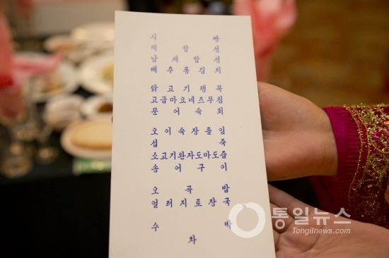 만찬 메뉴는 식빵, 떡합성(모둠), 남새합성(채소모둠), 배추통김치, 닭고기냉묵(편육형태), 고급 마요네즈무침, 문어숙회, 오이숙장졸임, 섭죽, 소고기완자토마토즙, 송어구이, 오곡방, 얼러지토장국, 수박 차 등으로 차려졌으며, 건배주로는 강계포인풍도술공장에서 만든 인풍술이 이용됐다.