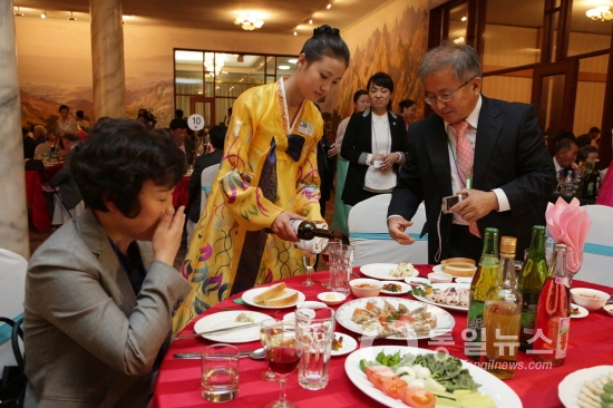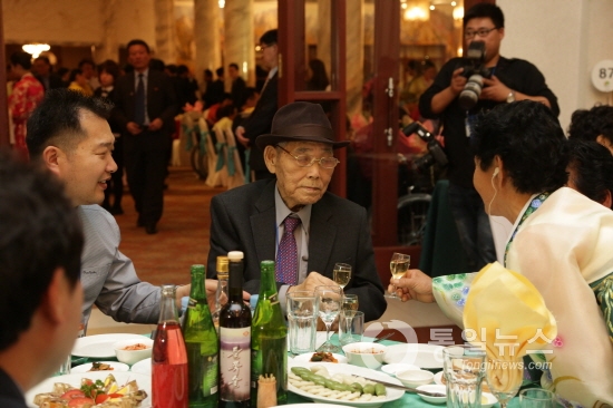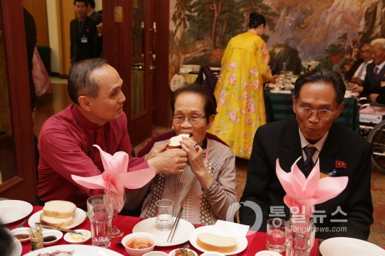 이날 오후 5시 단체상봉이 끝나자마자 북측 여성 접대원들은 분주히 테이블 세팅을 시작했으며, “아리랑‘, ‘반갑습니다’ 노래가 울려 퍼지는 가운데 북측 가족들을 태운 버스에 이어 남측 가족들이 2층 연회장에 자리를 잡으면서 환영만찬이 시작됐다.