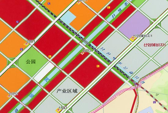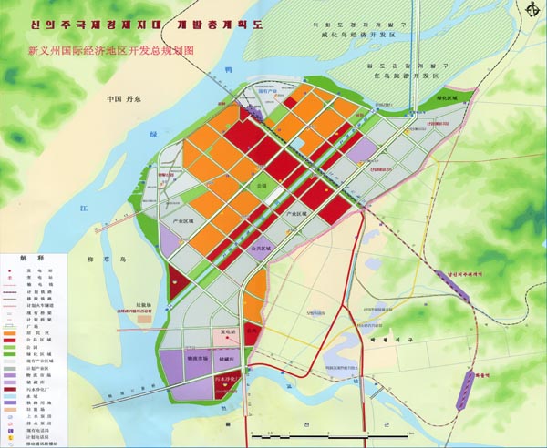 <통일뉴스>가 입수한 ‘신의주국제경제지대 개발총계획도’ 상에는 기존 산업구역 한 곳과 신규 산업구역 두 곳, 그리고 산업예비지 두 곳이 표기돼 있다. 북측은 신규 산업구역 중에서 한 곳을 남측이 원한다면 제공할 용의가 있다는 것.