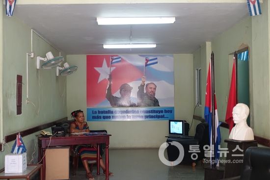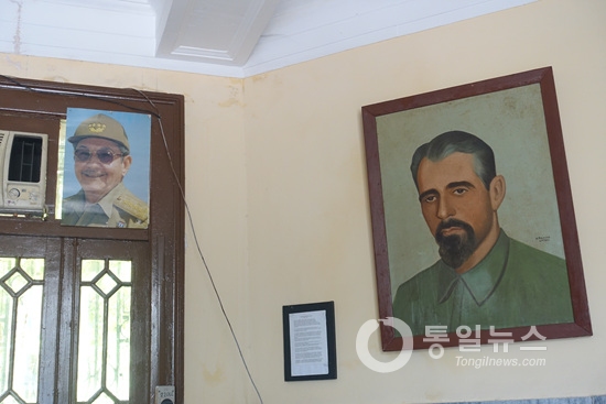 원장님이 학교 수위실로 간다. 우리도 뒤따라간다. 왼쪽 수위실은 문이 닫혀 있고, 오른쪽 수위실만 열려 있다. 안으로 들어갔다. 아무런 경계도 없다. 내부에는 피델, 라울, 체 게바라 등의 사진이 벽에 붙어있다. 그냥 비닐에 쌓인 채 붙어 있어서 우리 시골집에 내걸린 사진틀보다 나아 보이지도 않는다. 그래도 쿠바 최고의 국립대학교 정문 수위실에 이런 사진이 내걸리다니 하는 생각이 든다. 이 대표가 열심히 사진을 찍는다. 나도 덩달아 찍었다. 원장님이 수위와 뭐라고 대화를 나눈다. 하지만 우리가 그러고 있는 사이에도 그들은 끝내 나타나지 않았다.