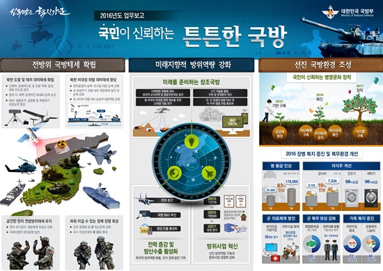국방부는 이날 청와대에서 열린 '2016년 업무보고'에서 "북한의 도발 및 테러 대비테세 확립, 북한의 비대칭 위협 대비태세 향상, 굳건한 한미연합 방위태세 유지, 싸워 이길 수 있는 정예장병 육성" 등을 통한 전방위 국방태세 확립을 강조했다.