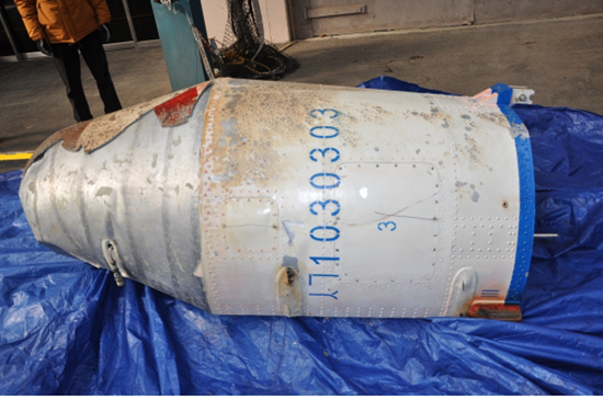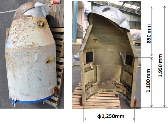 국방부는 이날 수거된 '광명성호' 페어링을 공개했다. 수거된 페어링은 총 길이 1,950mm, 둘레 1,250mm이다.