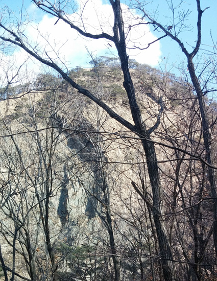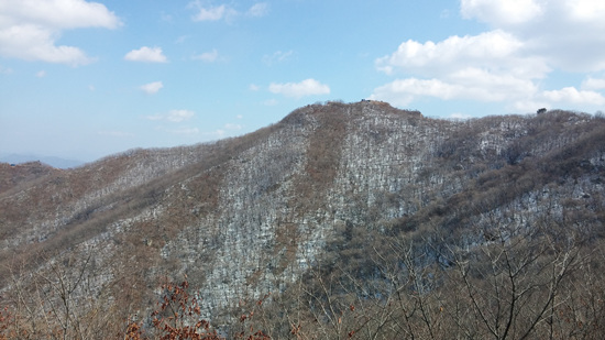 고대산 정상에서 단체사진 촬영을 하고 하산 길에 간단한 점심식사를 한 후 제2등산로를 따라 내려오는데 칼바위 부근에서 칼바람이 불었지만 날씨는 괜찮았다. 내려오며 곳곳에 약간의 눈과 얼음이 남아 있었다. 이곳은 눈이 많은 산으로 유명하지만 올해는 눈이 많이 안온 것 같다.