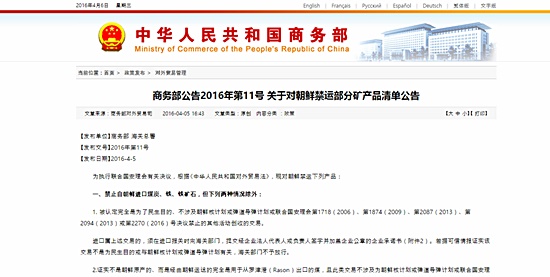 중국 상무부는 5일 오후 대외무역사(국) 명의로 해관총서에 보내는 ‘상무부 공고 2016년 제11호'를 올려 대북 교역 금지 품목을 공개했다.