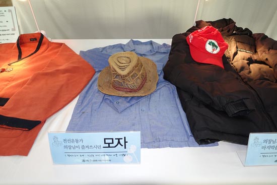 ▲ 민복과 잠바, 모자 등도 전시됐다. 고인은 모자를 즐겨썼다. [사진 - 통일뉴스 김치관 기자]