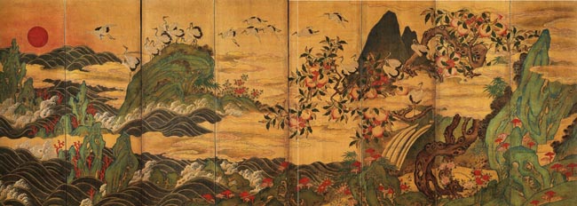 해학반도도는 장생도 중에 하나다. 바다와 학, 복숭아가 어우러지면서 나름의 독립적인 형식을 갖췄다. 복숭아가 그려져 있다는 것은 그곳이 곧 이상세계라는 뜻이다. [자료사진 - 심규섭]