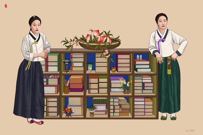 책과 각종 기물이 들어가 있는 책장에 기댄 아름다운 여선들을 그렸다. 책장의 윗부분에는 태평성대를 뜻하는 복숭아를 넣었다. 그림의 내용은 어렵지 않다. 또한 척 보면 무엇을 뜻하는지 알 수 있다. 태평성대를 추구하고 만드는 일은 비장하고 어려운 일이지만 즐겁고 기분 좋게 가야할 길이기도 하다. [자료사진 - 심규섭]