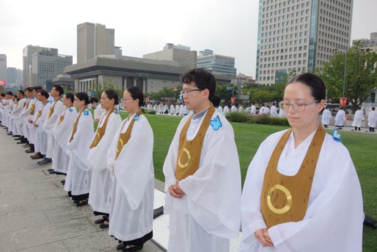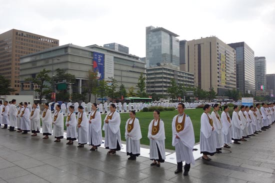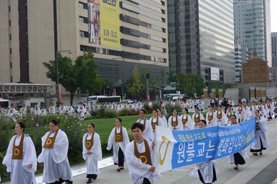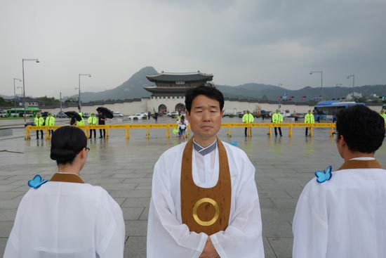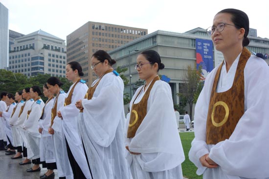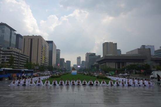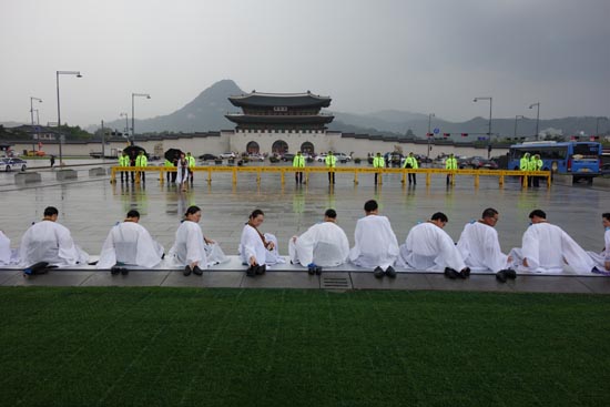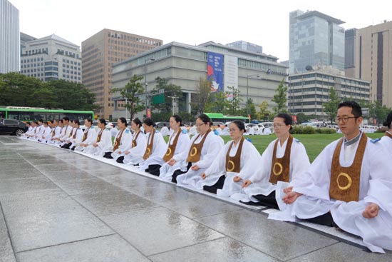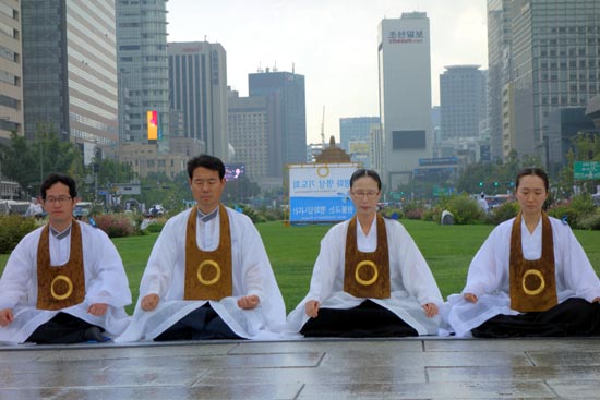 원불교 성직자들과 재가 신도들이 서울 도심 한 복판에서 빗속 입정(入定)에 들었다.