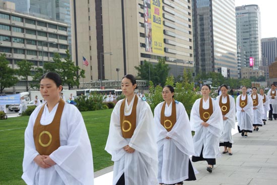 비가 내리는 가운데 광화문 해치마당에서 대열을 이뤄 광화문 방향으로 향한 이들은 20여분 동안 선 채로 평화명상기도를 진행한 뒤 자리에 앉아 입정에 들었다. 원불교에서 입정은 원래 자신이 갖고 있는 성품과 하나가 돼 일체의 사념을 잊어버린 상태를 뜻한다.