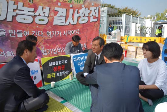 기자를 만난 정기섭 위원장은 “동병상련 처지”라고 농성장을 방문한 소감을 밝히고 ‘개성공단 쪽은 정부의 보상이 잘 이루어지고 있느냐’는 질문에 “언제 보상을 해줬느냐”며 “무이자 대출 지원이 전부”라고 불편한 심기를 감추지 않았다.