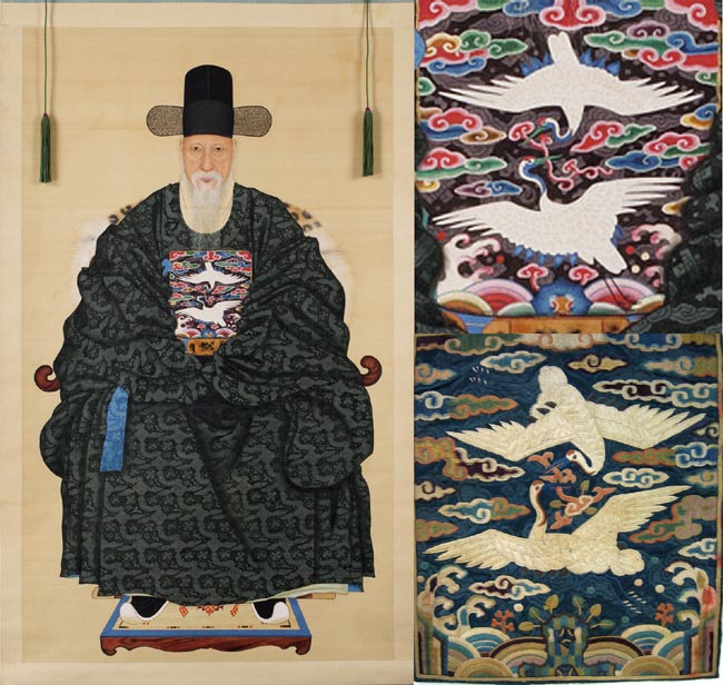 문인 관복의 흉배에는 쌍학이 그려져 있는데, 그 학은 영지를 물고 있다.
