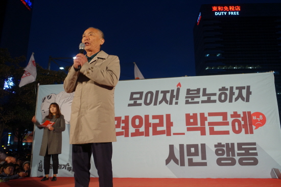 “이 불법정권, 불통정권, 살인정권 몰아내고 우리 국민의 힘으로 제대로 된 나라 한번 만들어 보자. 이제 박근혜는 더 이상 국민들을 고통의 도가니로 몰아넣지 말고 즉시 퇴진하라. 박근혜가 하야할 때까지 우리 모두 촛불 들고 일어서자.”