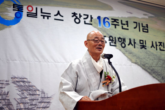 전 <민족21> 발행인 명진 스님은 "경제적 어려움 속에서도 지금까지 중단하지 않고 끌고 온 <통일뉴스>에 감사를 드린다"고 말문을 열며, 현 정국에 대한 입장을 해학적으로 밝혔다.