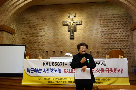 ‘KAL858기 가족회’와 ‘KAL858기 사건 진상규명 시민대책위원회’는 29일 오전 11시 서울 정동 프란치스코교육회관 성당에서 ‘KAL858기 사건 29주기 추모제’를 갖고 ‘2017년 KAL858기 실종 사건 30주년 계획’을 발표했다.
