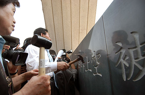 가족회와 시민대책위는 지난 2004년 6월 3일 서울 양재동 시민의숲에 세워져 있는 위령탑을 거부한다며 이를 부수는 상징의식을 가지려다 경찰과 충돌한 바 있다. 가족들은 준비한 망치를 들고 위령탑에 쓰여진 ‘피폭(被爆)’이라는 글자를 부수는 상징의식을 가지려했던 것. [관련기사 보기]