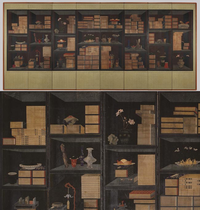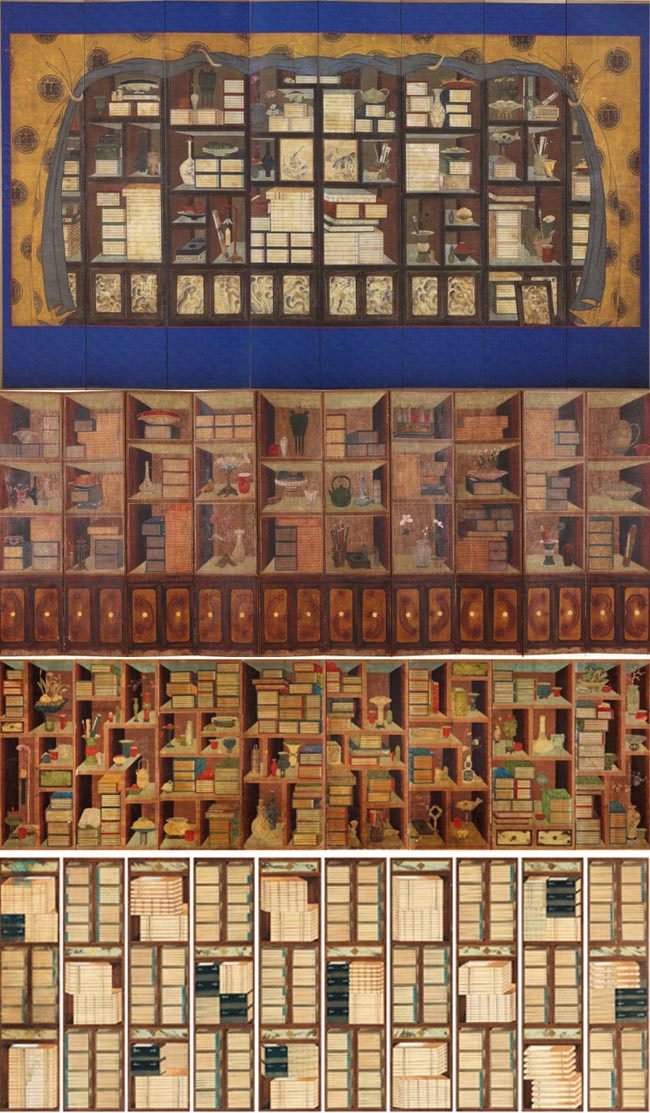 [책가도]가 무거워진 것은 순전히 책장 때문이다. 책장 자체의 질감이 어둡기도 하지만 선 원근법에 따른 명암을 표현했기 때문이다. 명암은 그야말로 밝고 어두움을 표현하는 방법인데,