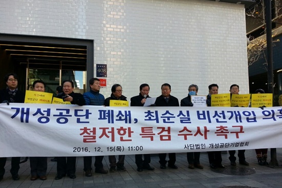 정부가 개성공단 전면 가동중단 결정을 내린 데 대해 개성공단기업협회(회장 정기섭)가 15일 최순실 국정농단 특별검사팀에 수사를 의뢰했다. 개성공단 가동중단 결정의 배후에 박근헤 대통령의 비선실세인 최순실 씨가 개입했다는 의혹 때문이다.
