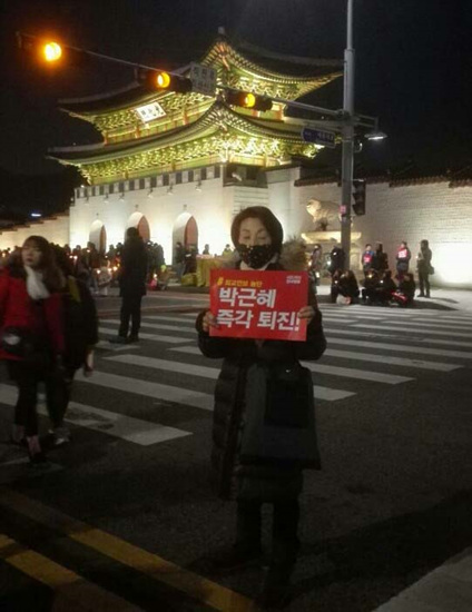 ▲ 제7차 촛불집회에 참석한 어머니가 인증샷을 찍었다.  [사진제공-리정애]
