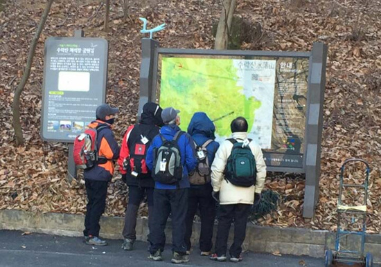 ▲ 수락산 입구에서 6.16산악회 회원들이 안내도를 보고 있다. [사진제공-리정애]