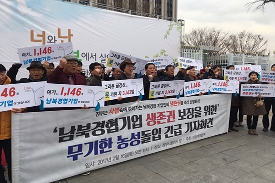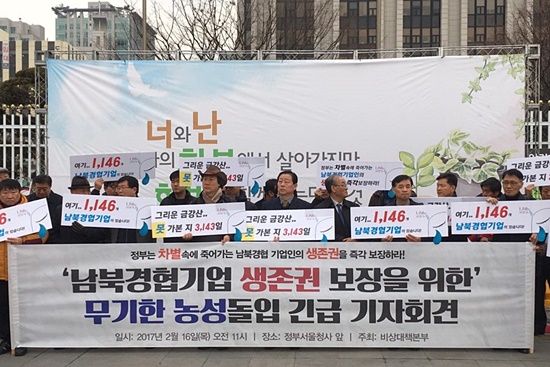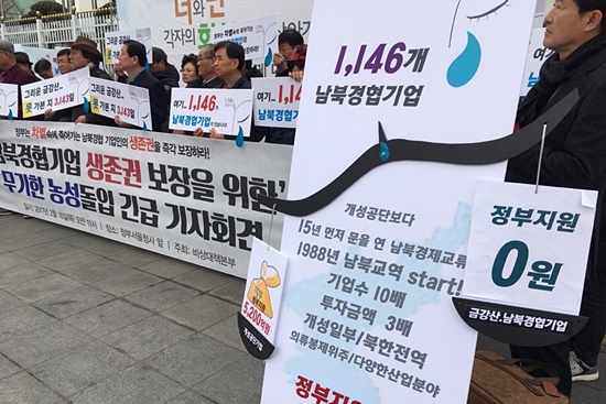 '남북경협기업의 생존권 보장을 위한 비상대책본부'(남북경협 비대본, 본부장 유동호)는 이날 오전 11시 서울 광화문 정부청사 앞에서 '남북경협기업 생존권 보장을 위한 농성돌입 긴급 기자회견'을 열었다.