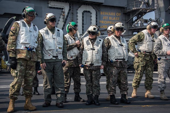 앞서 이순진 합참의장과 빈센트 브룩스 주한미군사령관은 13일 칼 빈슨호를 방문했으며, 이 의장은 "어느 때보다도 엄중한 현 안보 상황에서 항모강습단의 독수리훈련 참가는 미 전략자산이 언제라도 한반도에 전개할 것임을 보여준 것"이라고 의미를 부여했다.