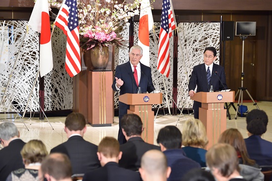틸러슨 장관은 이날 “우리(미.일)의 우선순위는 한국과의 3각 협력 확대”라고 여러 차례 밝혔다. 극우 성향 <산케이신문>이 ‘위안부 합의’를 둘러싼 한.일 간의 갈등을 지적하자 3각 협력의 중요성을 거론하며 “양국이 그 합의에 관해 신속한 결론에 이르기를 희망한다”고 밝혔다. 기시다 외무상은 미 국무부의 ‘북한에 대한 테러지원국 재지정’ 검토를 지지한다고 공개적으로 밝혔다.