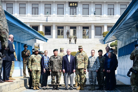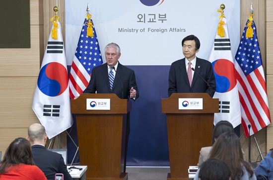 이날 오전 도쿄에서 전용기 편으로 오산 미 공군기지에 도착한 틸러슨 장관은 빈센트 브룩스 주한미군사령관과 함께 판문점을 둘러봤다. 오후 4시께 황교안 대통령 권한대행을 예방한 뒤 윤 장관을 만났다. 18일 오전에 이번 순방의 주 목적지인 중국으로 떠날 예정이다.