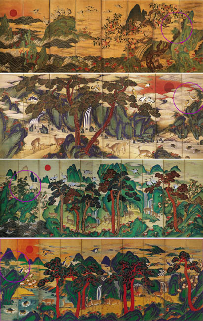 또한 학은 하늘을 대표하는 짐승이고, 사슴은 육지를, 거북은 물을 대표하는 동물이다. 여기에 영원성을 상징하는 아침 해를 표현했다.
