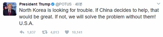 이날 트윗을 통해, 트럼프 대통령은 “북한은 문젯거리를 찾고 있다”면서 “중국이 돕기로 결정한다면 아주 좋은 일”이나 “그렇지 않으면 그들 없이 우리가 해결할 것이다! 미국이”라고 밝혔다.