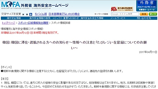 11일 일본 외무성은 ‘해외안전 홈페이지’에 “조선(한)반도 정세에 관한 정보에 주의해달라”는 경고문을 올렸다. “조선이 핵실험과 탄도미사일 발사를 반복하고 있어서 이번에 다시 공지를 내게 됐다”는 설명을 덧붙였다.